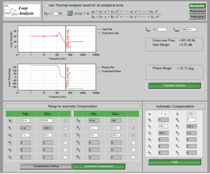 Loop analysis is a tool to let user arbitrarily draw a transfer function by varying the coefficient or component from the feedback block. On the other way, curve fitting can be done by entering points of expected gain or expected phase, by pressing "Automatic Compensation" button, the coefficient of the transfer function or components will be changed to fit those points.