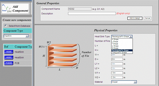 To add the heat sink, select “HeatSink” from the Component Type and click “Add”. You can customize the shape,
